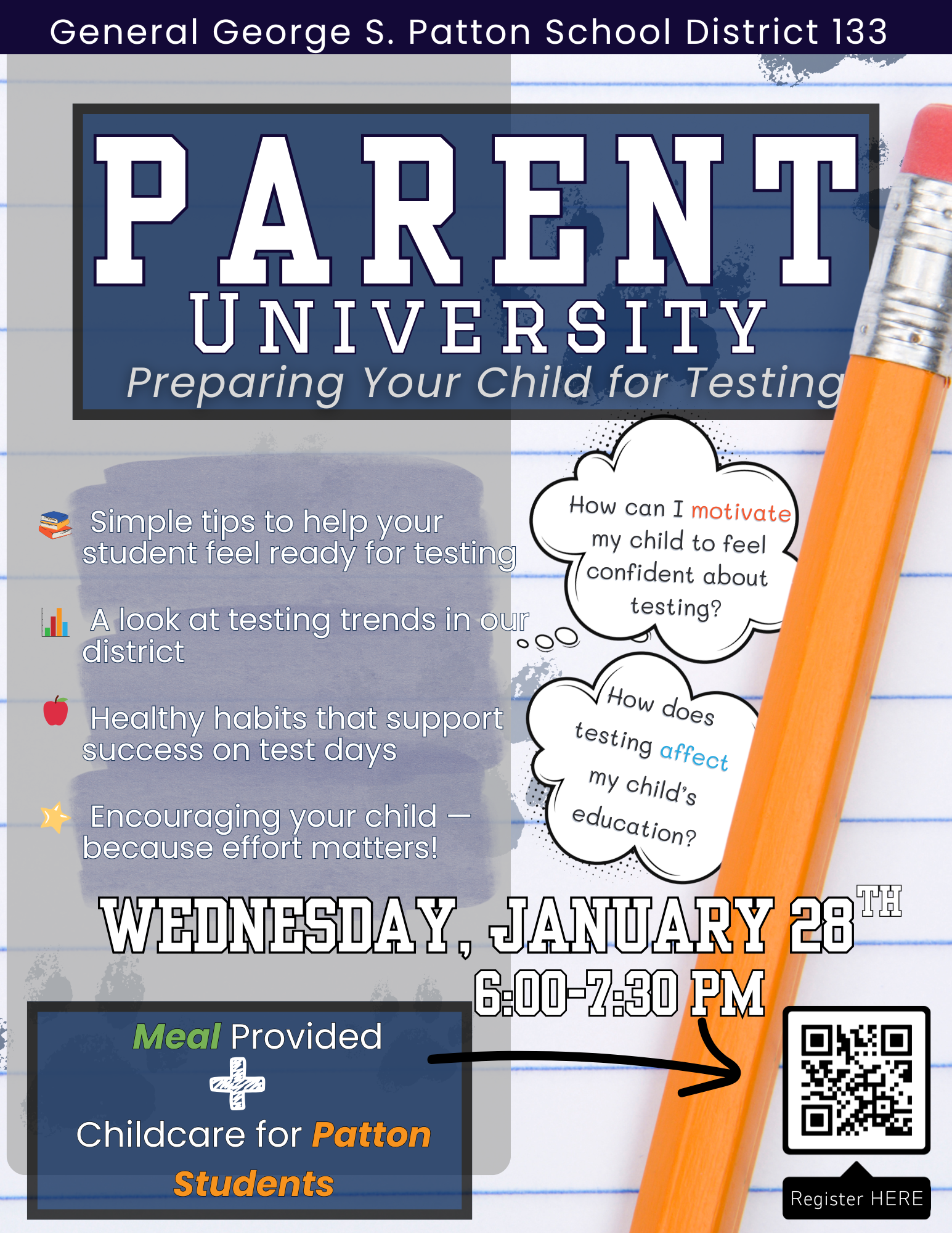 “ Parent University is happening Wed., Jan. 28, 2026 from 6–7:30 PM! Learn simple ways to help prepare your child for testing. Food will be provided, and childcare is available for Patton students.